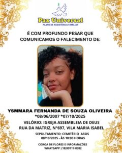 Às 10 horas, será sepultada a jovem estudante Ysmmara Fernanda de Souza Oliveira (foto abaixo), de 18 anos, que está sendo velada na Igreja Assembleia de Deus da vila Maria Isabel, de onde sairá o cortejo fúnebre às 9h30. Segundo o profissional médico que assinou a Certidão de Óbito, a jovem estudante morreu na Santa Casa de Assis na madrugada desta terça-feira, dia 7 de outubro, vítima da H1N1.