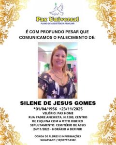 No final da manhã, às 10h30, será sepultada a senhora Silene de Jesus Gomes (foto abaixo), de 69 anos, que está sendo velada no Centro Funerário Pax Home, na rua Padre Anchieta, 1280, de onde sairá o cortejo fúnebre às 10 horas.