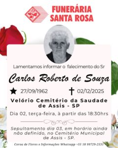 Há três sepultamentos programados para esta quarta-feira, dia 3 de dezembro, no Cemitério Municipal da Saudade, em Assis.