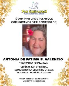 Há dois sepultamentos programados para esta sexta-feira, dia 5 de dezembro, no Cemitério Municipal da Saudade, em Assis.