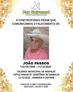 Na cidade de Maracaí, será sepultado o senhor José Passos (foto abaixo), de 85 anos.