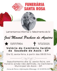 Há um sepultamento programado para esta sexta-feira, dia 12 de dezembro, no Cemitério Municipal da Saudade, em Assis.
