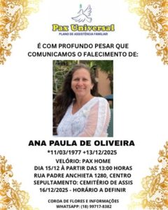DIA 16 – Ana Paula de Oliveira (foto abaixo), de 58 anos, que está sendo velada no Centro Funerário Pax Home, na rua Padre Anchieta, esquina com avenida Perimetral, será sepultada às 8h30 de terça-feira, dia 16.