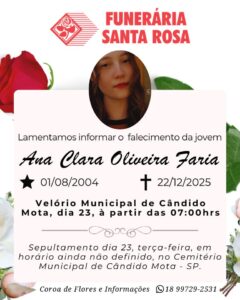 REGIÃO – Na vizinha cidade de Cândido Mota, será sepultada a jovem Ana Clara Oliveira Faria (foto abaixo), de 21 anos, vítima de acidente ocorrido na noite de domingo, dia 23, numa rodovia, quando voltava da cidade de São Carlos-SP, onde ela estudava.