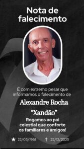 No final da tarde, às 16 horas, haverá o sepultamento de Alexandre Wagner Gomes Rocha, conhecido pelo apelido de ‘Xandão’ (foto abaixo), de 64 anos, que está sendo velado na sala 5 do Centro Funerário São Vicente, de onde sairá o féretro às 15h30.