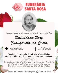 REGIÃO – Em Cândido Mota, será sepultada a senhora Natividade de Nery Evangelista da Costa (foto abaixo), de 75 anos.