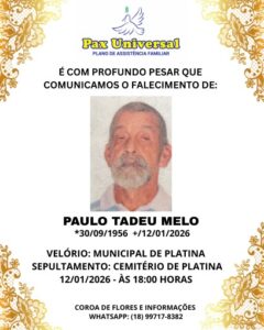 DIA 12 – Nesta segunda-feira, dia 12 de janeiro, em Platina foi sepultado o senhor Paulo Tadeu Melo, de 69 anos.