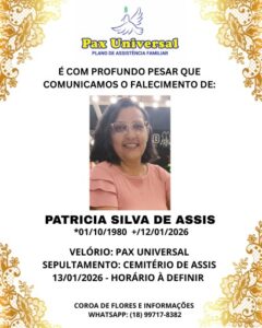 Às 14 horas, será sepultada Patrícia Silva de Assis (foto abaixo), de 45 anos, que está sendo velada no Centro Funerário Pax, na rua Smith Vasconcelos, na esquina do Hospital Regional, de onde sairá o cortejo fúnebre às 13h30.