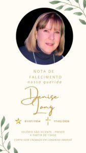 O corpo de Denise Ângela Lang estará sendo velado na sala 5 do Centro Funerário São Vicente, na avenida Abílio Duarte de Souza, a partir das 14h30 desta terça-feira.